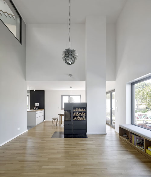 Das Konzept des Hauses sind besonders wichtige, kommunikative Punkte der Nutzung, die durch dreidimensionale Raum- und Sichtbezüge betont werden und geschlossenen Bereichen in die sich die Bewohner zurückziehen können.