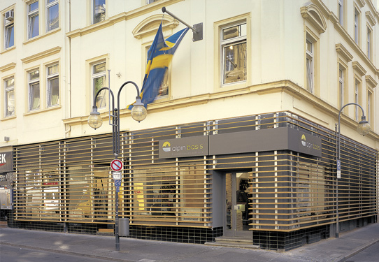 Das Outdoor-Sportgeschäft erstreckt sich über zwei Geschosse mit vielen kleinteiligen Flächen. Da die Flächen aus statischen Gründen nicht zusammengeschlossen werden konnten, wurde ein Designkonzept entwickelt, das viele unterschiedliche Räume erzeugte. Diese werden über den gesamten Verkaufsbereich durch das zentrale Gestaltungselement einer Brettstapelkonstruktion als »abstrakte Übersetzung« einer Felswand zusammengefügt. Die Gestaltung reicht bis zu den Umkleideräumen in »Waldatmosphäre«.