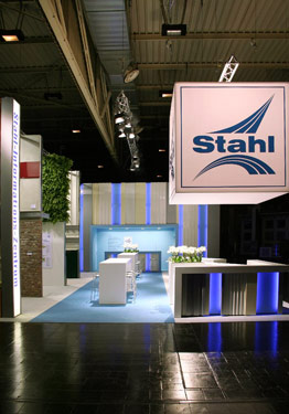 5,00 m hohen Systemwänden wird die Einsatzvielfältigkeit und Leistungsfähigkeit von Stahl zum Schwerpunkt "Sanierung und Bauen im Bestand" präsentiert. Dem vielfältigen Informationsangebot des Stahl-Informations-Zentrums wurde durch einen großzügigen Bereich mit Beratungstischen und Schriftenboards eine adäquate Plattform gegeben. Über die präzise geplante Beleuchtung wurde das Raumgefüge des Messestandes zu einem sehr einprägsamen Gesamtbild inszeniert, das einen hohen Wiedererkennungseffekt hat.
