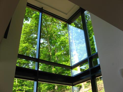 Haus H ist ein modernes Einfamilienhaus. Die ausgeglichen proportionierte Kubatur bietet Raum für die privaten Räume des Bauherren und einen zusätzlichen Gästebereich mit Bad und separatem Eingang. Herzstück der Hauptwohnung ist das großzügige Wohn- und Ess¬zimmer mit offener Küche und einem 2-geschossigen Luftraum. Durch die großzügigen Fenster und die über Eck offene Fassade wird der direkte Bezug zwischen angrenzendem Wald und Innenraum hergestellt. Im oberen Geschoss wird der Lichteinfall und der Ausblick über eine Galerie ermöglicht. Sorgfältige Detailierung und Ausführung bestimmen das feine Zusammenspiel der Elemente. Schiebetüren in Holz und Glas sowie Wandschränke und Garderobe wurden individuell angefertigt.