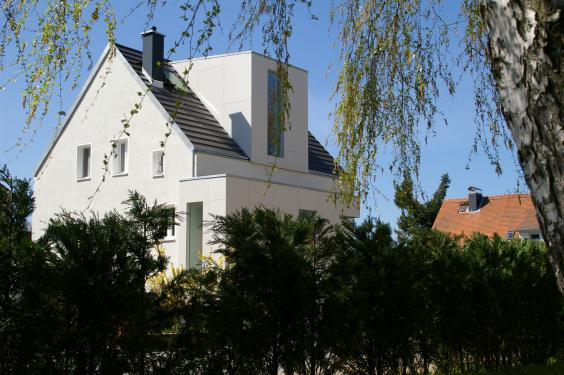 Das Gebäude wurde umfassend in Hüllkonstruktion und Anlagentechnik saniert. Es erreicht den KfW-Effizienzhaus-Standard. Der Bau aus den 50er Jahren wurde in seinem Typus durch einen neuen Eingangsvorbau und einer Gaube in reduzierter Gestalt und hervorgehobener Materialität neu interpretiert und in seiner Wohnfläche erweitert. Zur Verbesserung des Wohnkomforts wurde eine Lüftungsanlage mit Wärmerückgewinnung eingebaut. Durch diese werden auch die Schallimmissionen aus dem Flugverkehr minimiert.
