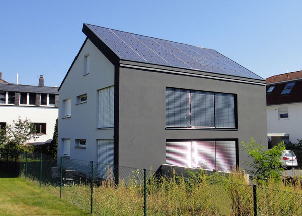 Das Zweifamilienhaus erzeugt über die Jahresbilanz mehr Energie als es verbraucht. Die Gebäudehülle ist in allen Teilen im Passivhausstandard ausgeführt. Über die gestalterisch hervorgehobene Südfassade mit dem übergehenden Dach wird die Energie gesammelt, die das Gebäude versorgt: passiv über den Sonnenlichteinfall durch die großen Fensterflächen in allen Geschossen, aktiv über eine Photovoltaikanlage, deren Stromerzeugung den Bedarf von Haustechnik, Beleuchtung und Haushaltsstrom deckt.